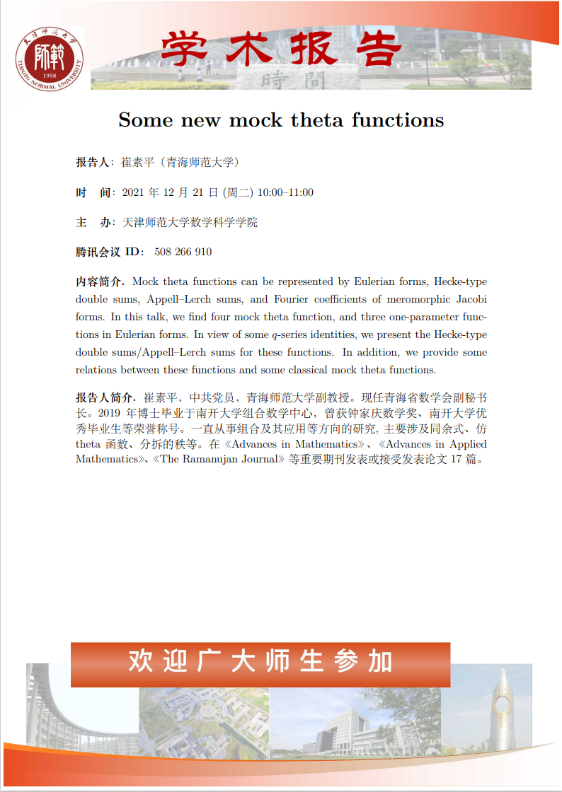 【预告】学术报告(2021-30)12月21日报告——Some new mock theta functions