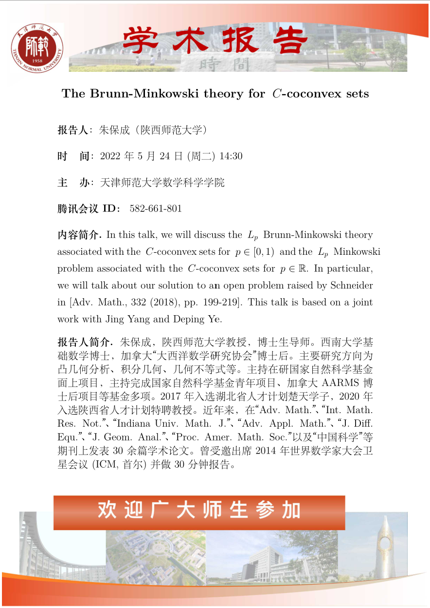 【预告】学术报告(2022-6)5月24日报告--The Brunn-Minkowski theory of C-coconvex sets
