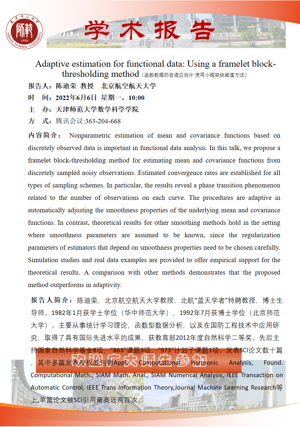 【预告】学术报告(2022-9)6月6日报告--Adaptive estimation for functional data: Using a framelet block-thresholding method