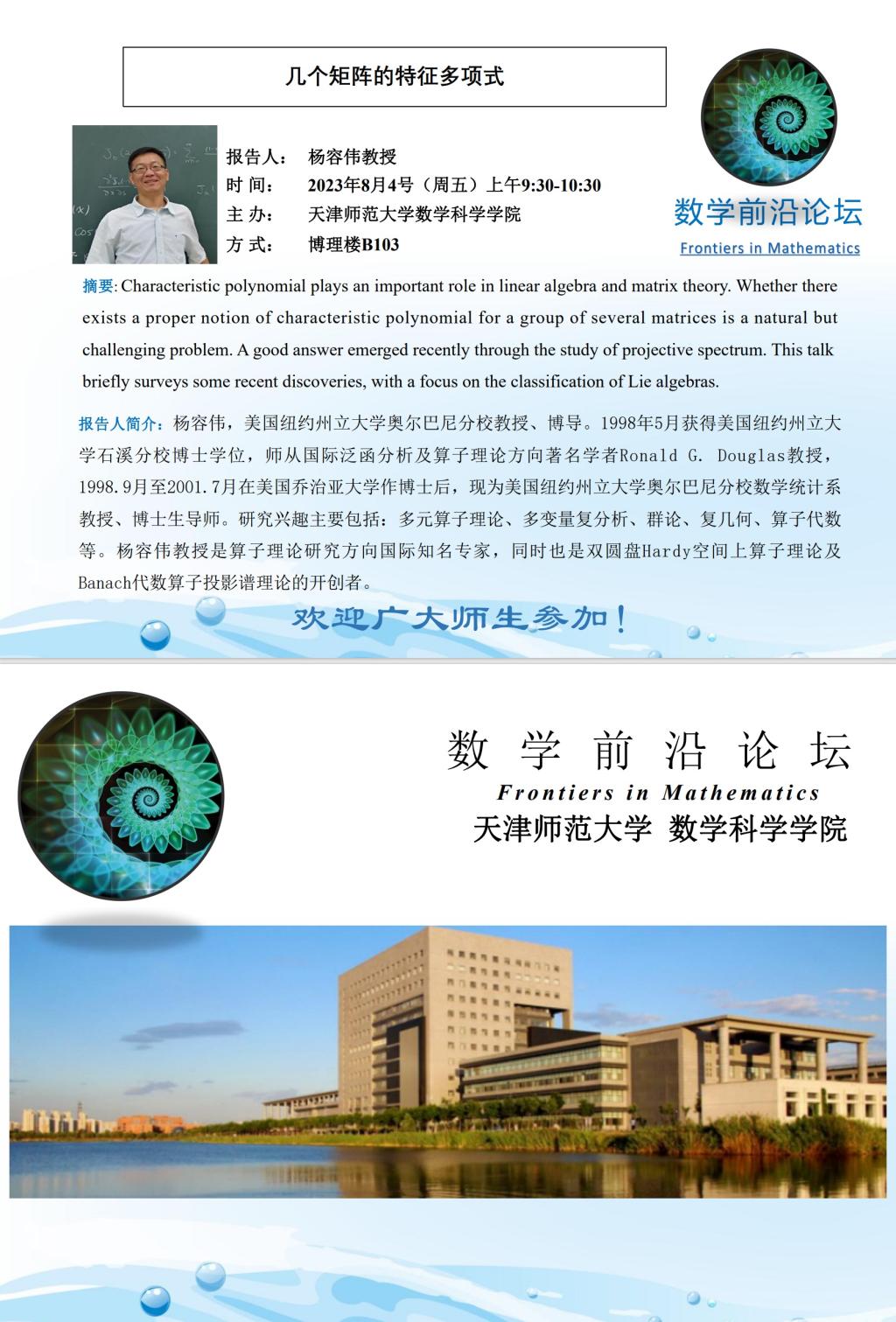 【预告】学术报告(2023-23)8月4日—几个矩阵的特征多项式