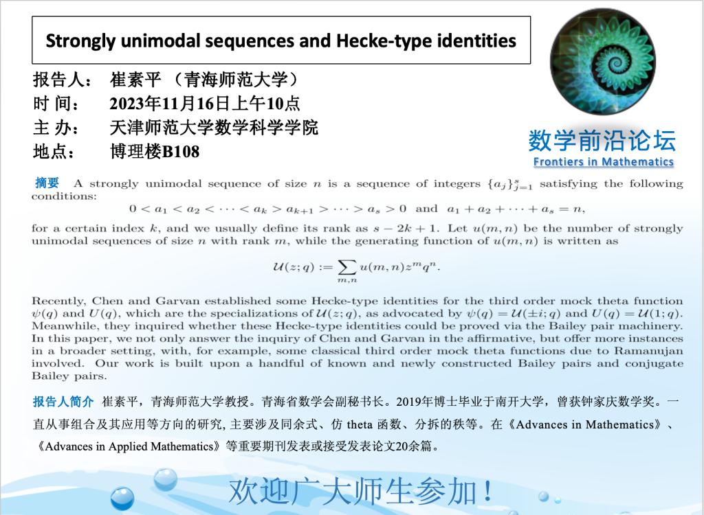 【预告】学术报告(2023-37)11月16日— Strongly unimodal sequences and Hecke-type indentities