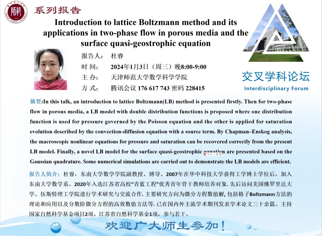 【预告】学术报告(2024-1)1月3日—Introduction to lattice Boltzmann method and its applications in two-phase flow in porous media and the surface quasi-geostrophic equation