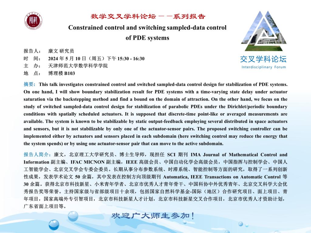 【预告】学术报告(2024-8)5月10日——Constrained control and switching sampled-data control of PDE systems