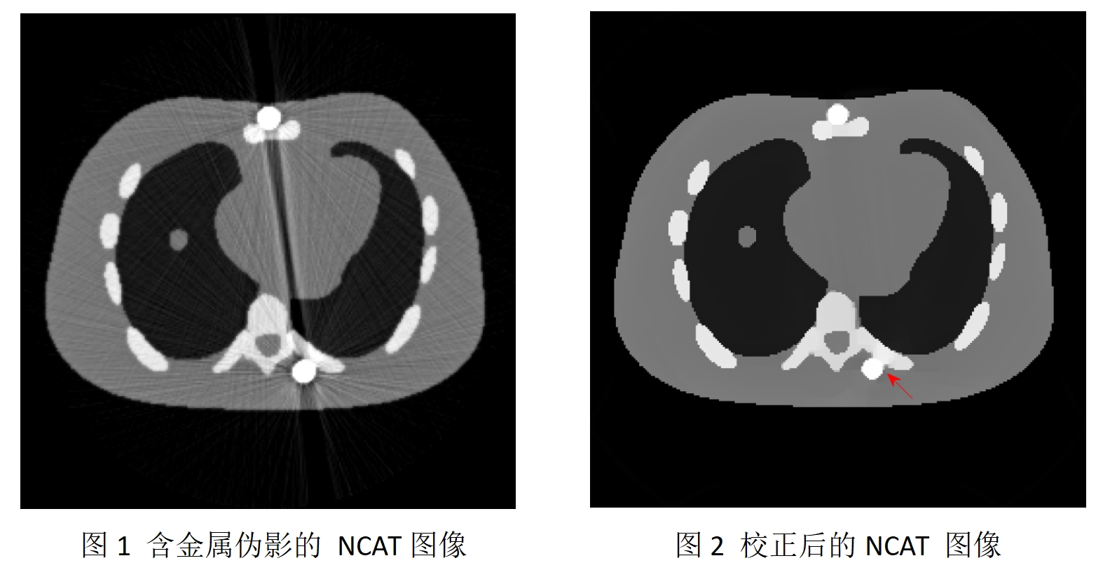 随着医疗技术的进步和新型医用金属材料的不断创新和发展,医疗植入物的需求不断增加,例如骨科植入物、牙科填充物、和冠状动脉支架。但高密度金属假体的存在会使重建的 CT 图像严重退化,导致解剖结构信息丢失,同时伪影的结构可能与某种病灶相似,从而引发误诊等医疗事故。该论文提出一种新的非凸加权变分方法校正金属伪影。不同于常规的使用金属轨迹掩膜的二值化权函数,该方法根据金属伪影在不同区域强度差异,设计了自适应权重,以实现区域性差异化修复从而优化重建效果。进一步采用非凸的正则化强化边界的对比度,引入图像的有界性约束进一步提升重建精度。基于全变差的预对偶形式,设计了两类有效且全局收敛的一阶原对偶算法求解上述非凸模型。大量数值实验结果验证了该方法的有效性(图1,图2),特别在预分割不准确的情况下,所提出的算法的重建精度得到显著提升。此外,所提出的全分裂算法比当前最具代表性的重加权JSR算法相比,计算速度平均提升两倍。